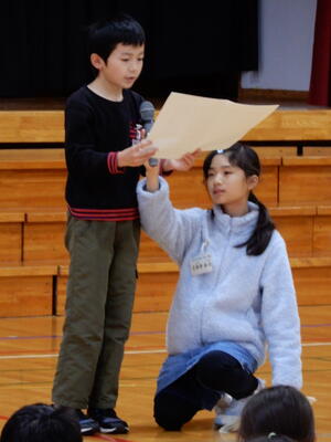 演説をしている候補者の方を、他の候補者や推薦責任者も見つめています。その姿から、お互いを応援し合う気持ちや、「5年生みんなで学校を引っぱっていくんだ」という団結力が感じられました。