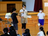 2学期の始業式が行われました。2年生と5年生のがんばりたいことの作文発表がありました。校長先生からは、桶づくりの例から「友だち一人ひとりの良さを認め合って、がっちりスクラムを組んで取り組んでほしいと思います。2学期もみんなの笑顔が学校中に広がるように元気に過ごせるといいですね」とお話がありました。