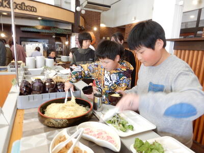 ボウリングでたくさん遊んで、お腹はペコペコです。さぁ、お待ちかねのバイキングのスタートです。お店のご厚意で、なんと今日は「貸し切り」!なんだかVIPな気分です。