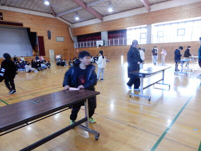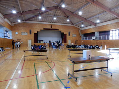 投票が終わってみんなが教室に帰ったあとの体育館です。立候補者、推薦責任者、選挙管理委員が集まっています。