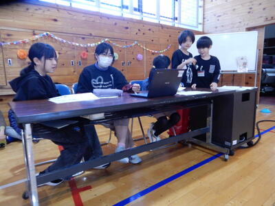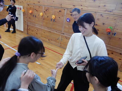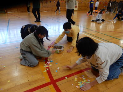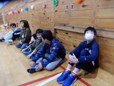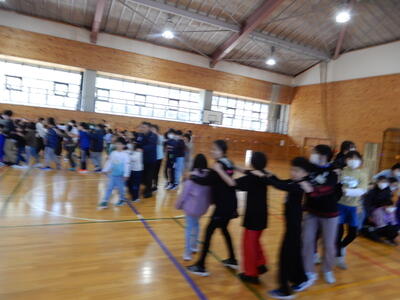児童会長のあいさつが終わったら、全校で交流ゲームです。「ジャンケン列車」と「学校クイズ」で、学年を越えた「なかよしの輪」が広がりました。