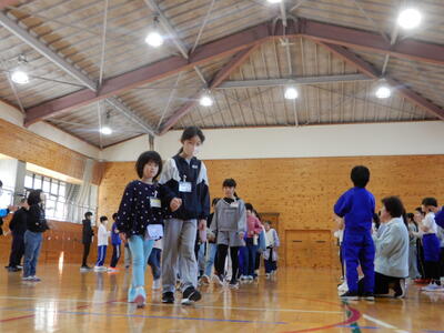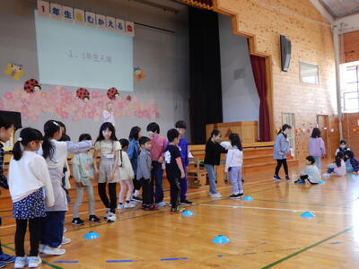 「6年生を中心に、みんなでつくった『1年生を迎える会』がステキでした。ジャンケン列車では、最後に全校みんなでつながって、校長先生には、学校目標の『なかよしのわ』が見えました。」