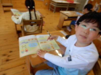 ② 教室に帰ったら1年生はさっそく「算数」の時間。まっさらの教科書をワクワクしながら開きます!