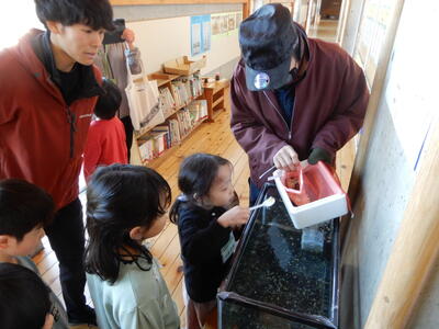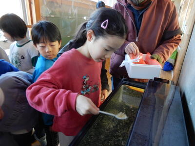 さぁ、いよいよ卵を水槽に入れます。スプーンでそっと、大切に、卵を沈めていきます。1年生はみんな、ちゃんと順番を守ってなかよく並んでるところも、1年間の成長が感じられます。2年生は水槽の底まんべんなく卵が散らばるように、細やかな手の動きで入れていきました。